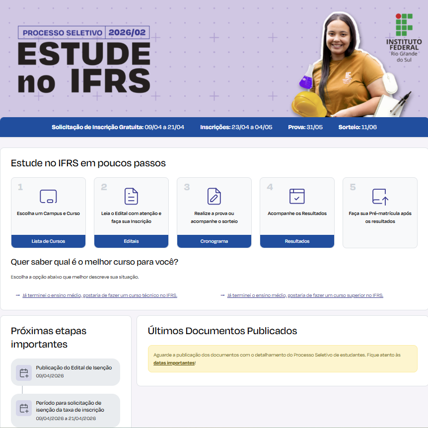 Estudantes que desejam ingressar em um curso ainda em 2026 já podem se preparar: o edital do Processo Seletivo 2026/2 do Instituto Federal de Educação, Ciência e Tecnologia do Rio Grande do Sul...
