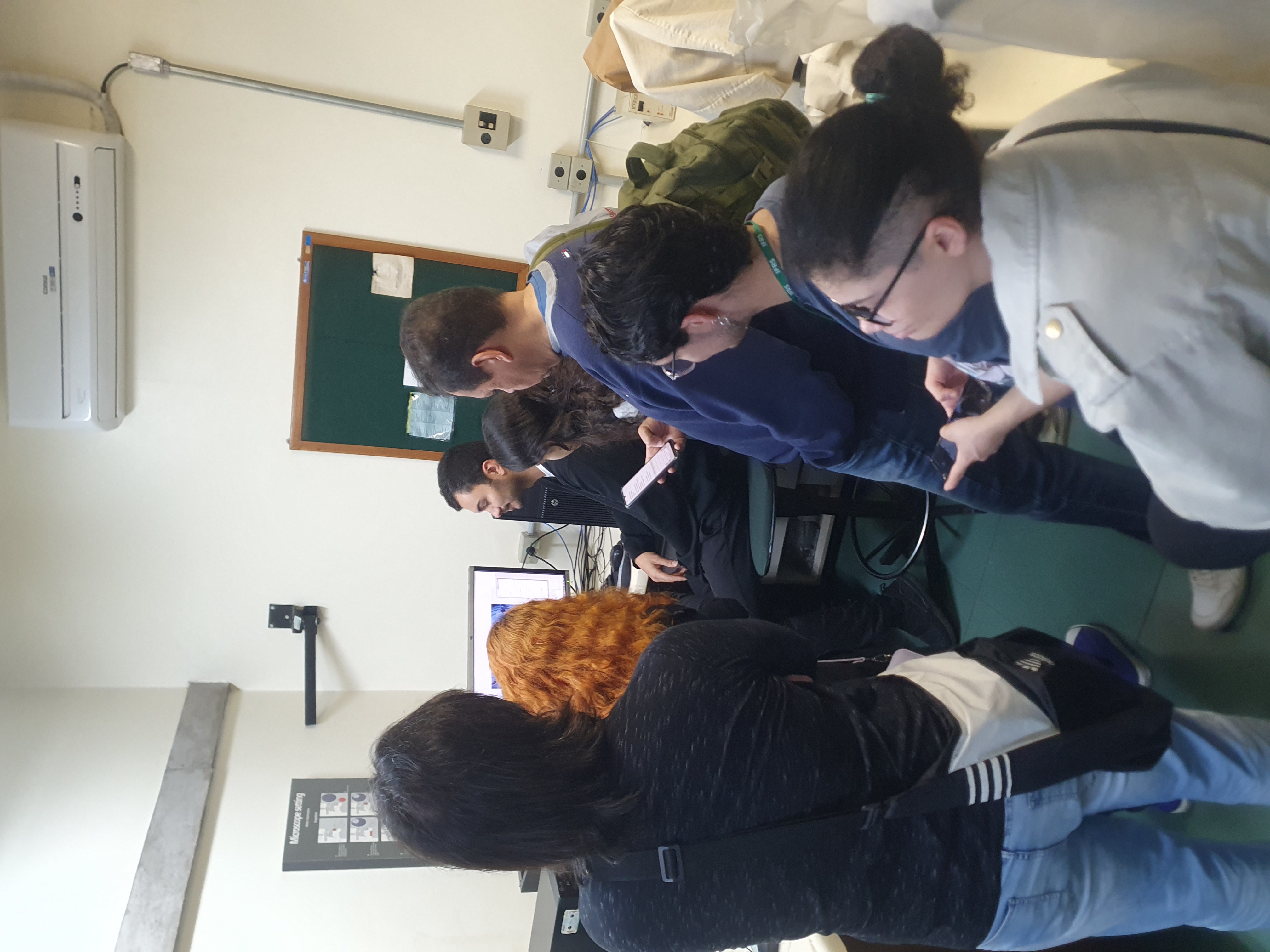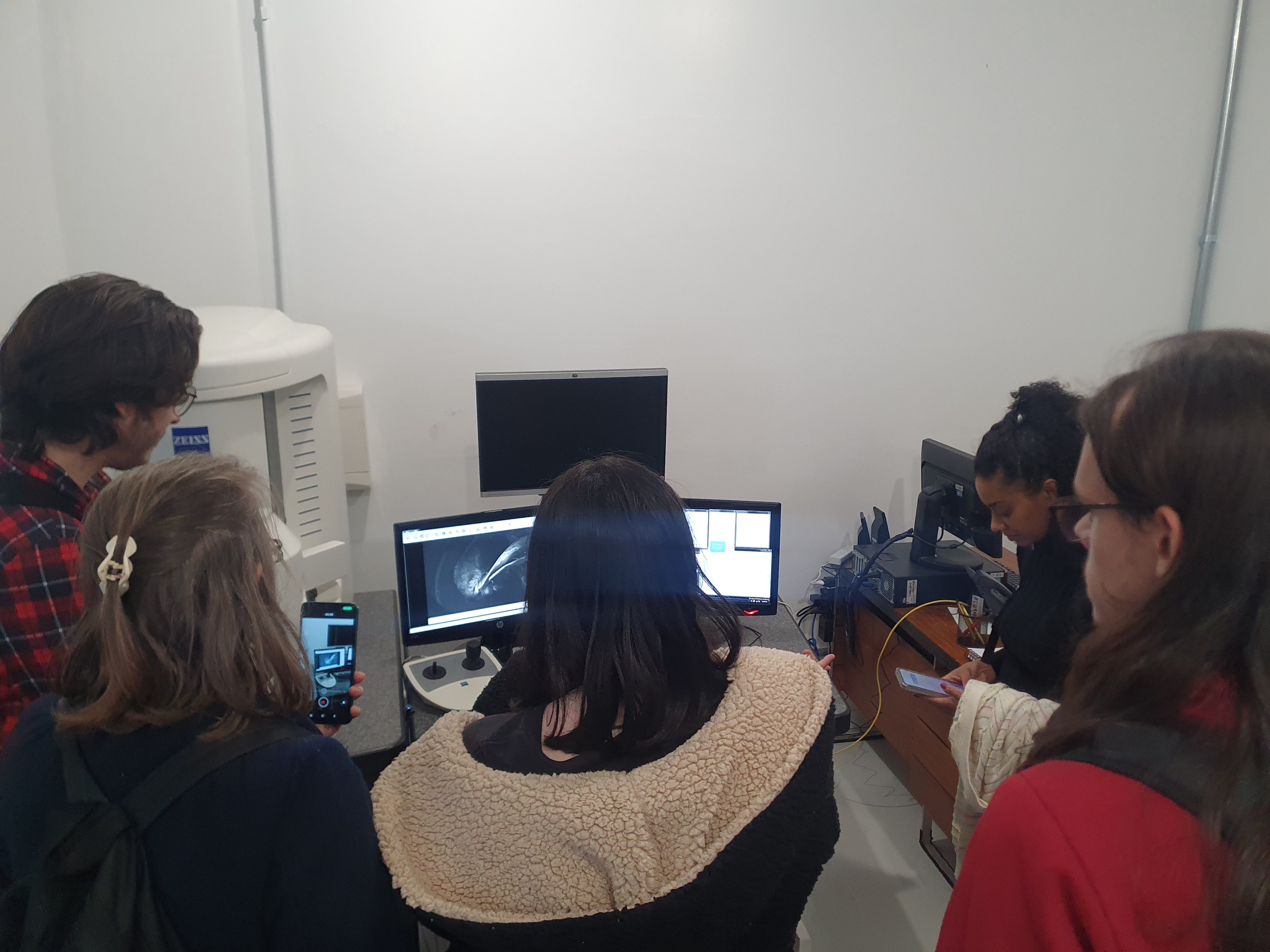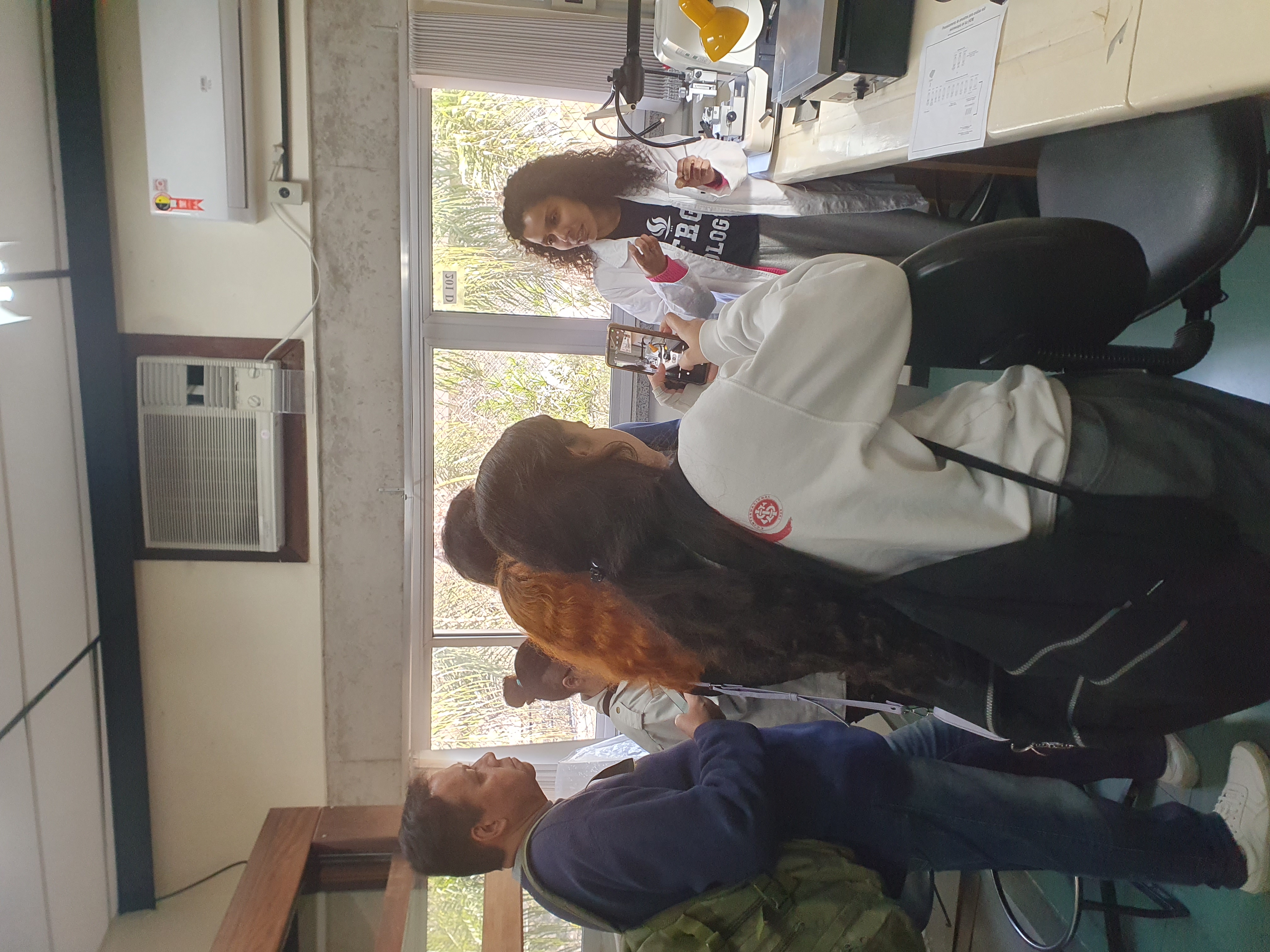 Inicialmente a(o)s estudantes foram recebidos no LaVeg pelo professor Rinaldo Pires dos Santos, o técnico Jordano e a bolsista premium Juliana L. Mariano que explanaram sobre as diferentes técnicas para análise de tecidos vegetais em microscopia óptica utilizadas naquele laboratório e suas aplicações, bem como, os procedimentos de preparação de amostras para visualização em Microscopia Eletrônica de Transmissão (MET).