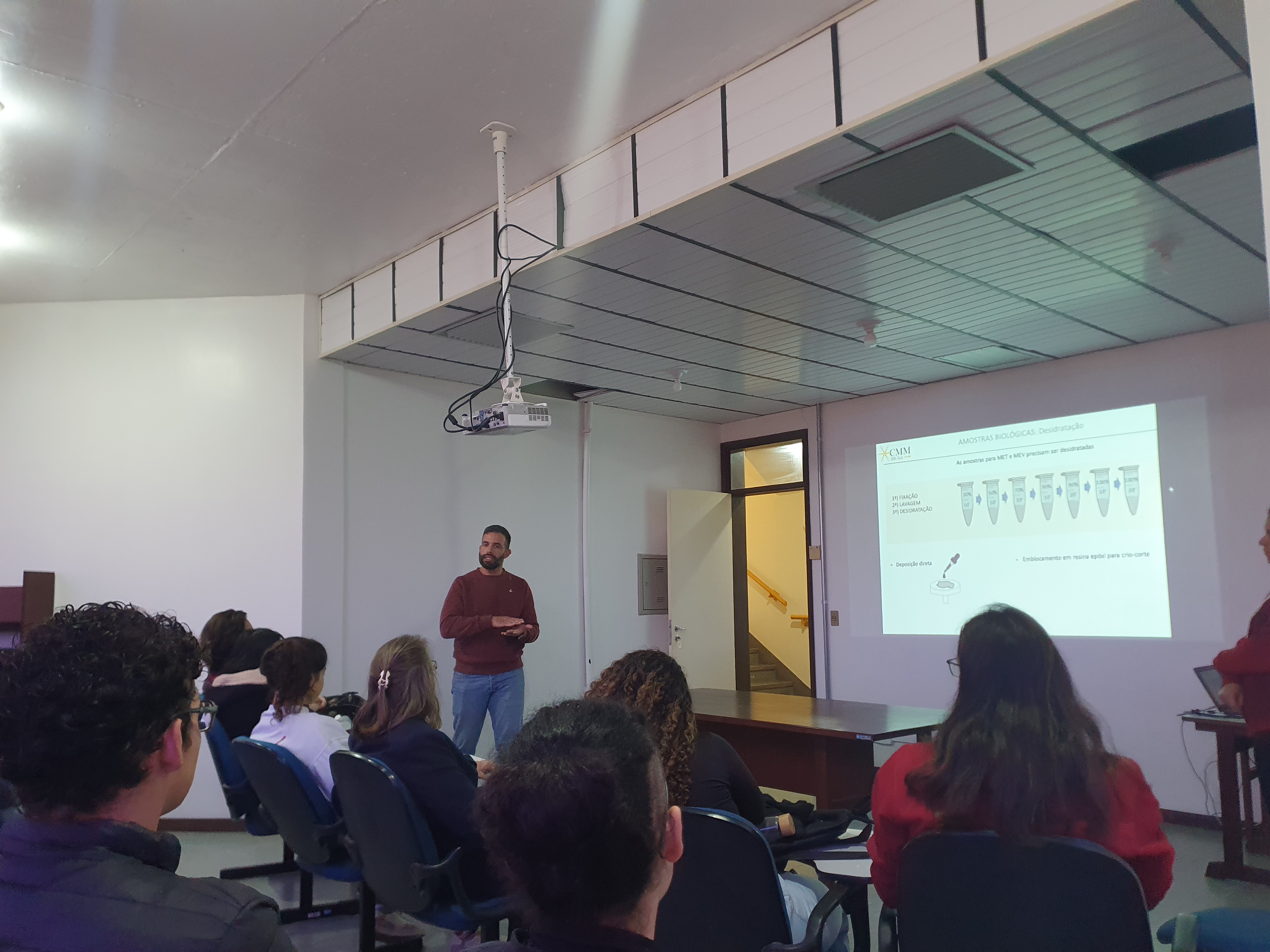 A seguir, a turma se dirigiu ao CMM, onde puderam conhecer os equipamentos usados na MET e observar o funcionamento do Microscópio Eletrônico de Varredura (MEV). A turma foi recebida pelo diretor do CMM, Paulo F. P. Fichtner, os técnicos Denise Bohn, Francis Almeida e pela bolsista Manoela C. Gomes.