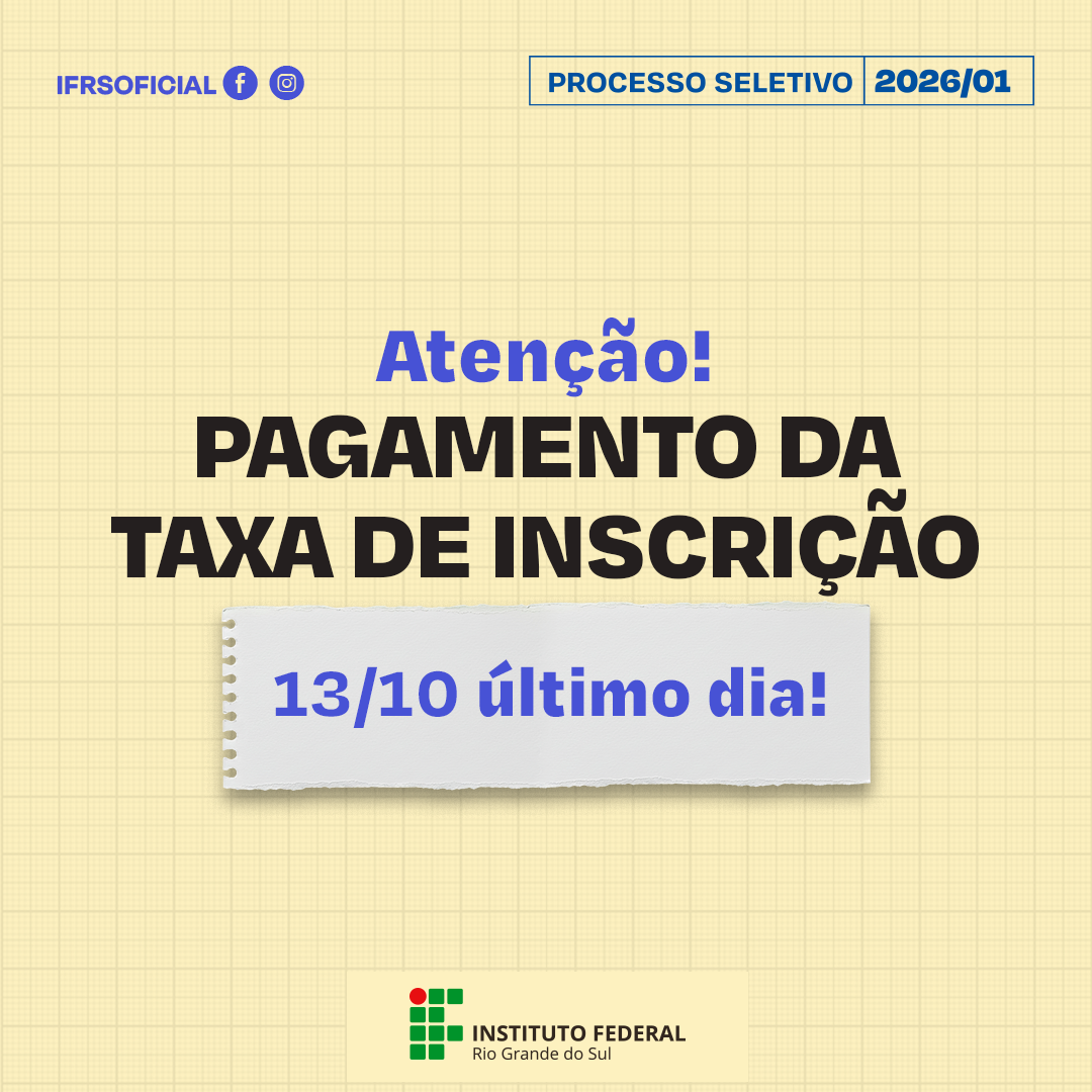 Esta segunda-feira, 13 de outubro de 2025, é o último dia para pagar o boleto da taxa de inscrição do Processo Seletivo de Estudantes 2026/01 do Instituto Federal de Educação, Ciência e...