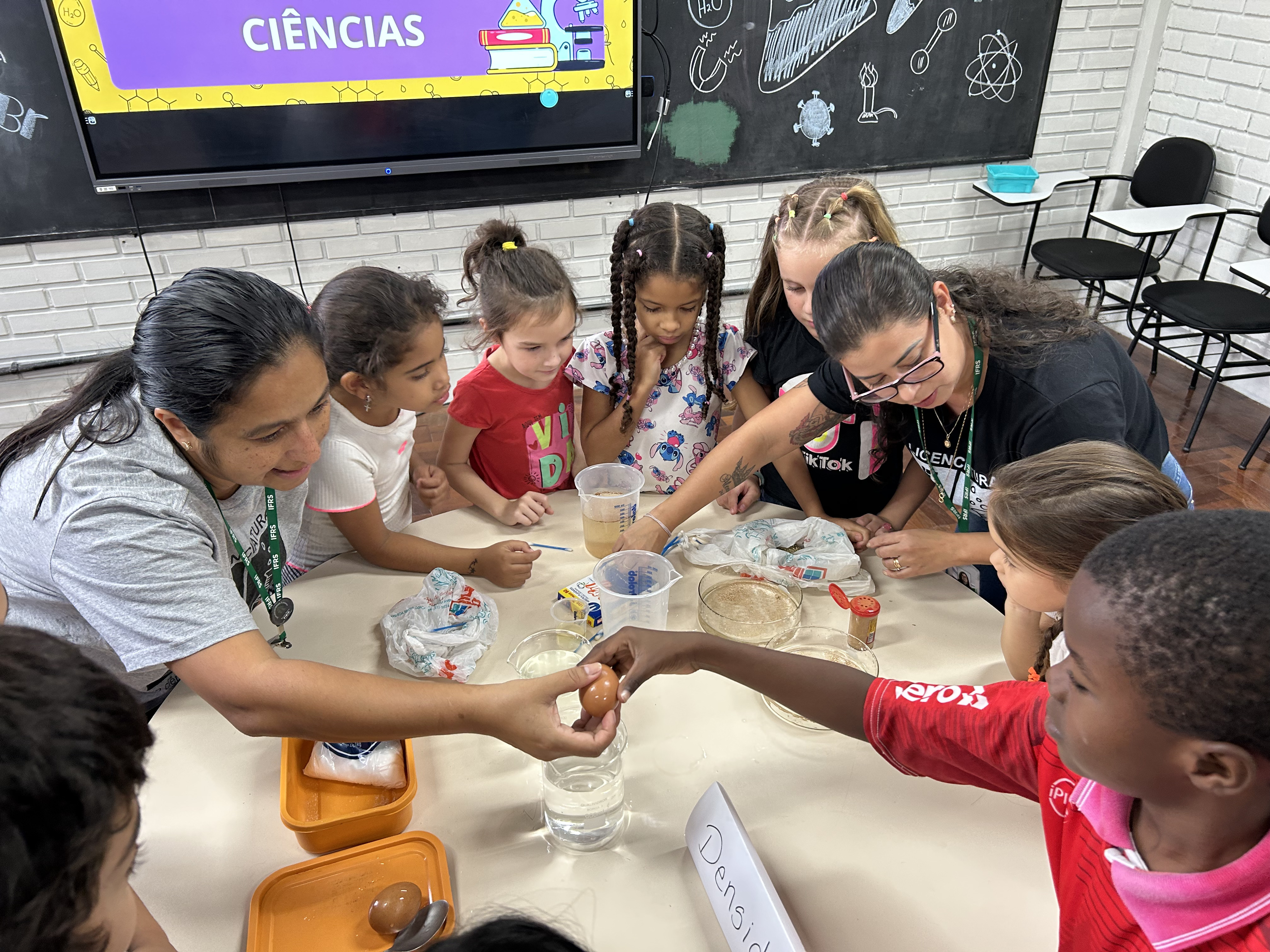 Outro experimento foi sobre densidade, no qual os alunos testaram se um ovo afundaria ou flutuaria em soluções com diferentes concentrações, comparando os efeitos da água pura e da água com o sal.