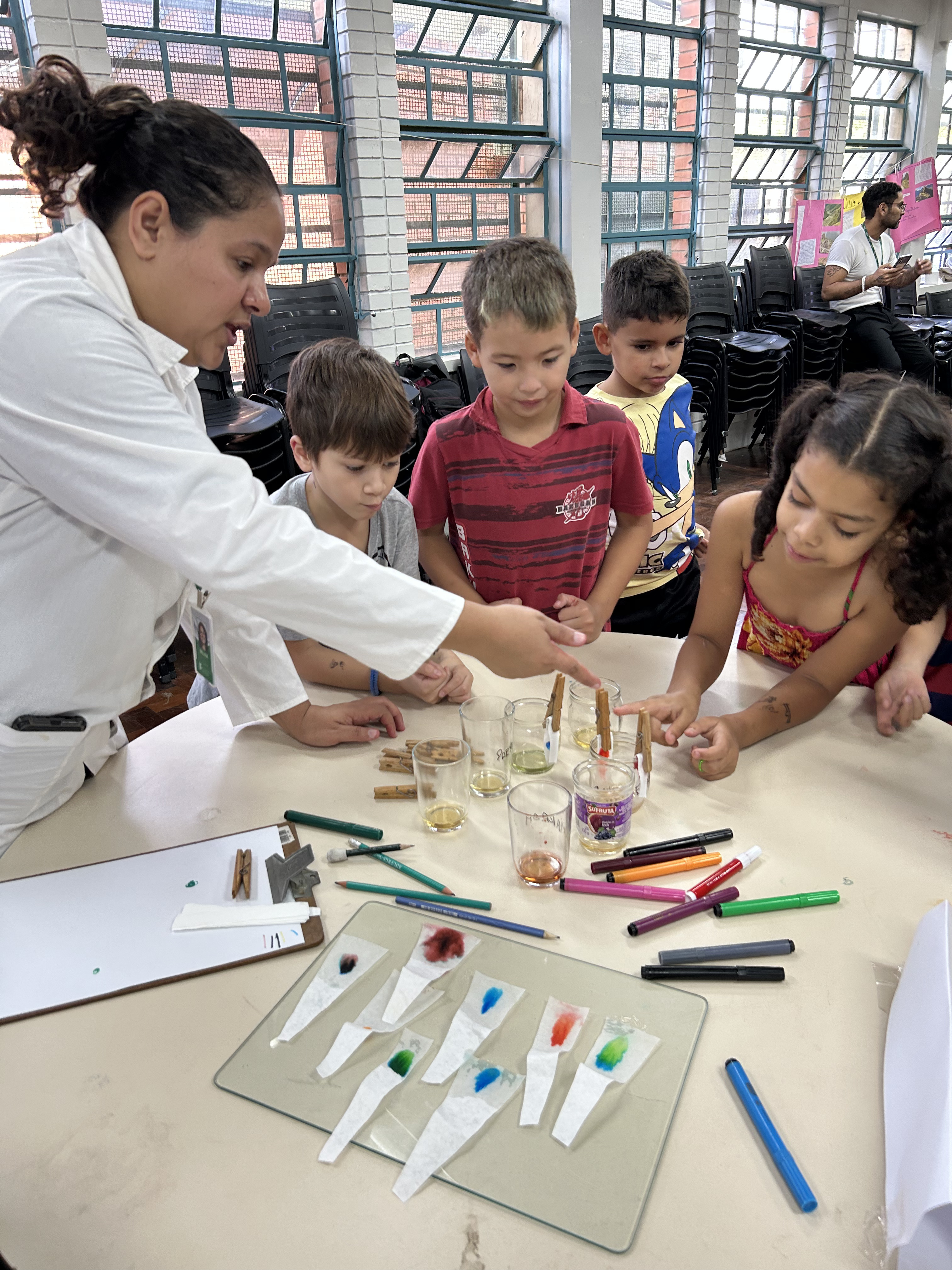 A atividade de cromatografia com canetinhas também atraiu a atenção: utilizando papel filtro, canetinhas coloridas e vinagre de maçã, as crianças puderam observar a separação das cores, compreendendo como uma única tonalidade pode conter diversos pigmentos.