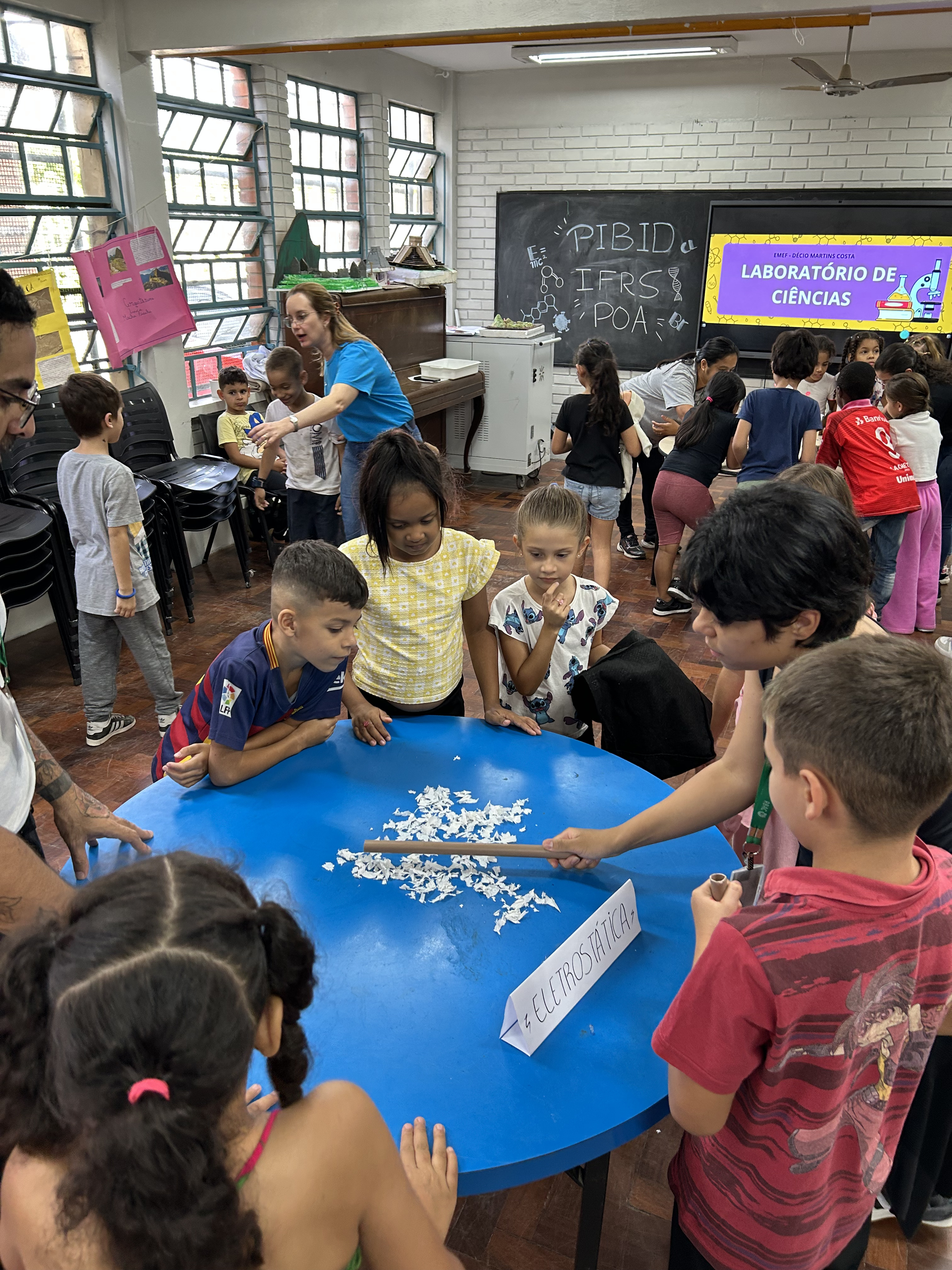 Para concluir a tarde, os pibidianos apresentaram um experimento divertido sobre eletrostática: utilizando um tubo de PVC, que era carregado ao ser friccionado contra uma superfície, os estudantes mostraram como pequenos pedaços de papel podiam ser atraídos e até se erguerem sozinhos, como em um número de mágica. A experiência capturou a atenção das crianças, que logo quiseram repetir o experimento e entender seu funcionamento.