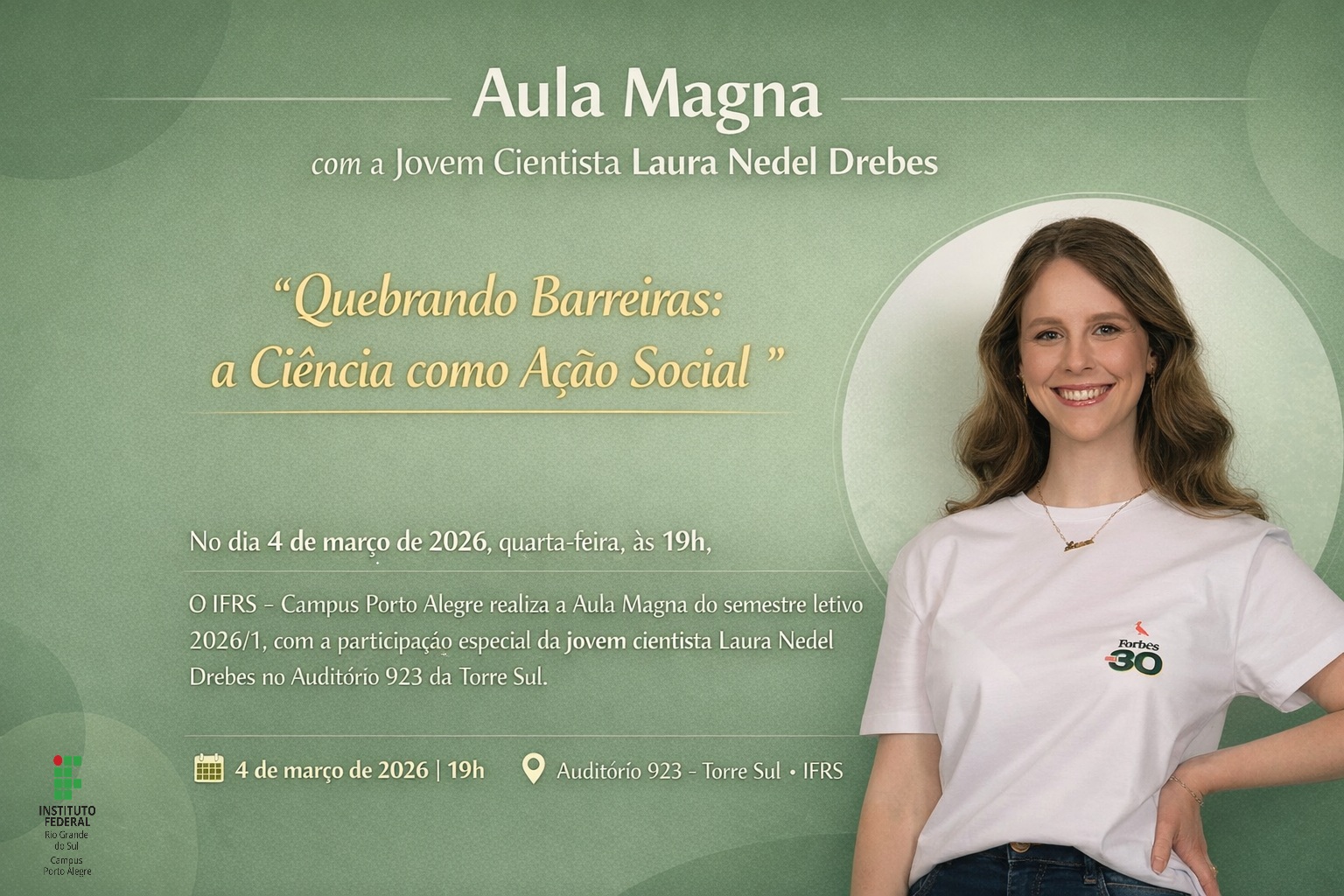 “Quebrando Barreiras: a Ciência como Ação Social ” No dia 4 de março de 2026, quarta-feira, às 19h, o IFRS – Campus Porto Alegre realiza a Aula Magna do semestre letivo 2026/1, com a...