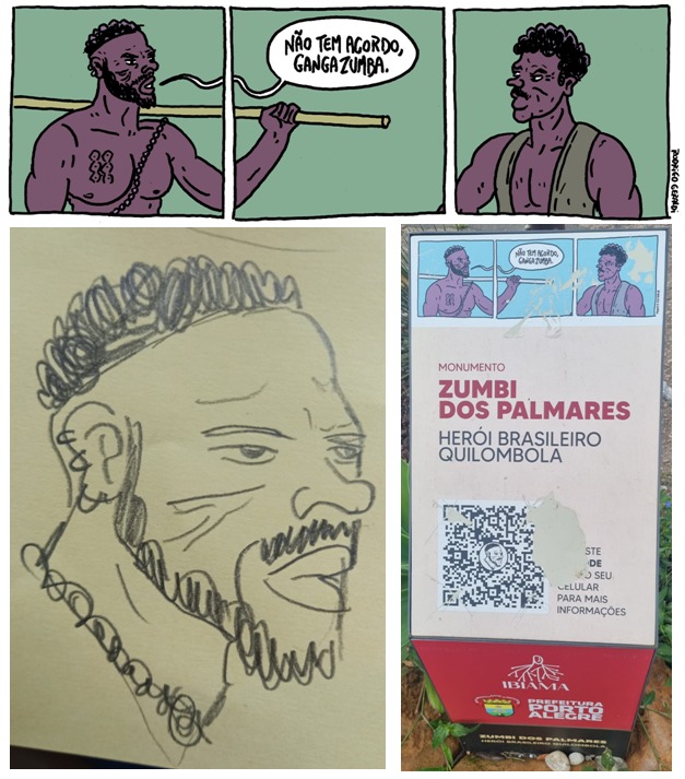 Rodrigo falou sobre a experiência e o desafio de retratar Zumbi dos Palmares em um desenho pequeno (tirinha) e que representasse a grandeza desse herói brasileiro. Havia um conjunto de requisitos e de exigências que precisavam ser respeitados na elaboração do desenho de Zumbi dos Palmares, dentre os quais: barba simbolizando sua sabedoria; brincos como sinal de poder e de prestígio; a lança enfatizando a luta do povo negro em busca de liberdade; as cordas da capoeira (dois laços) mostrando resistência à violência sofrida; e, a emblemática tatuagem na forma de um ideograma proverbial quioco de um ninho de pássaro que significa resguardo e liberdade. Todos estes elementos estão presentes no desenho.
