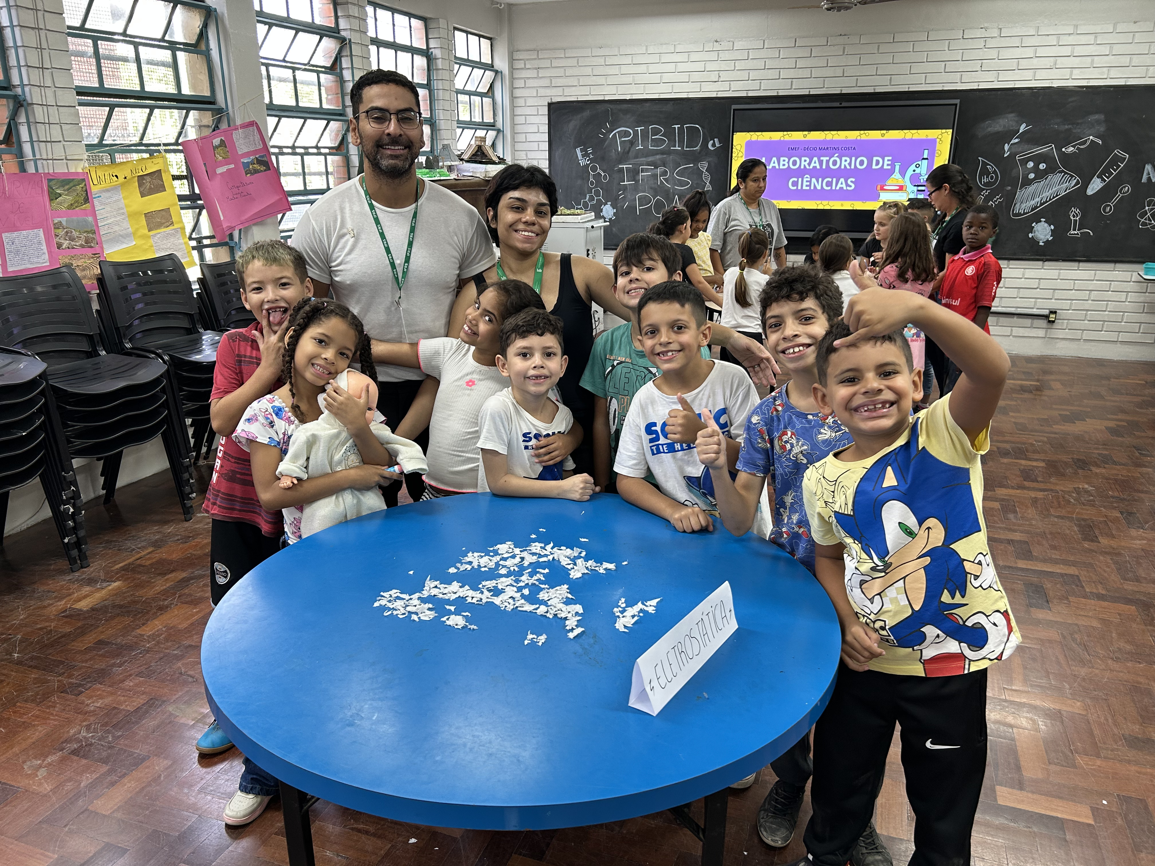 Para concluir a tarde, os pibidianos apresentaram um experimento divertido sobre eletrostática: utilizando um tubo de PVC, que era carregado ao ser friccionado contra uma superfície, os estudantes mostraram como pequenos pedaços de papel podiam ser atraídos e até se erguerem sozinhos, como em um número de mágica. A experiência capturou a atenção das crianças, que logo quiseram repetir o experimento e entender seu funcionamento.