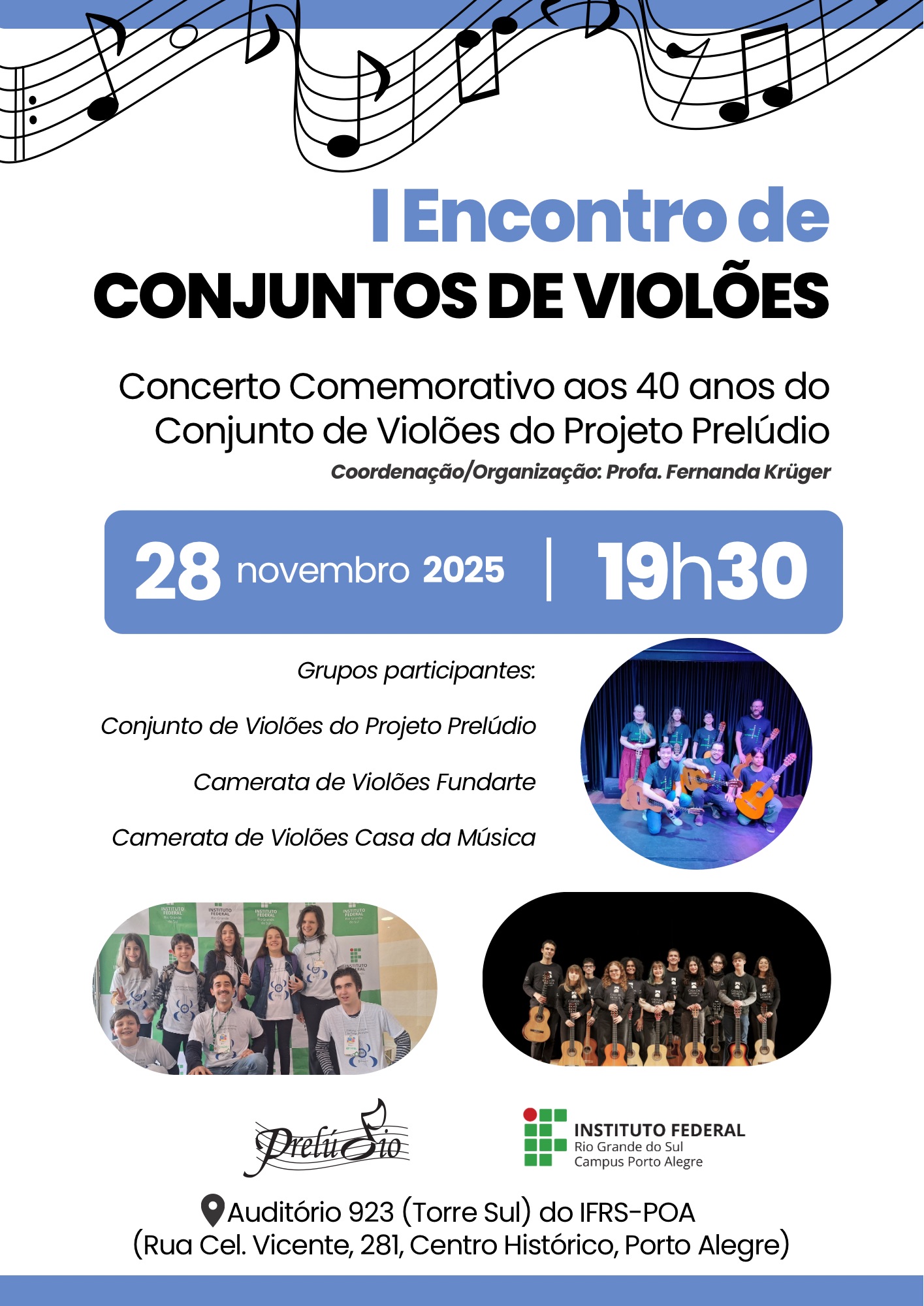 O recital proposto é uma forma de marcar os 40 anos deste grupo musical do Programa Projeto Prelúdio. O Conjunto de Violões iniciou suas atividades em 1985, quando o Projeto Prelúdio ainda era um programa de extensão da UFRGS, e tem existido desde sua fundação, ano a ano, estimulando a prática musical em conjunto de crianças e jovens.
