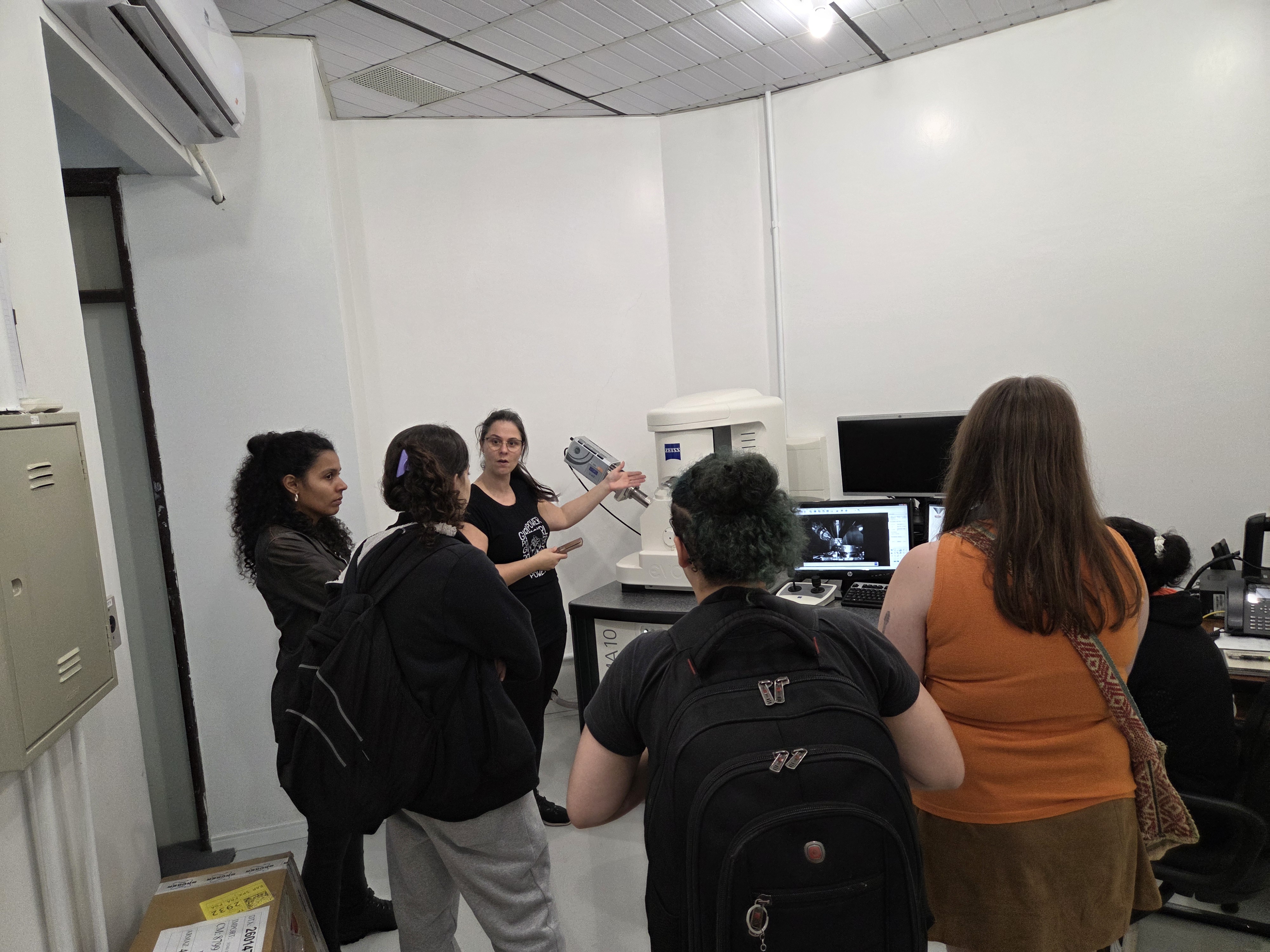 Durante a passagem pelo Laveg, os estudantes conheceram equipamentos e técnicas essenciais para o estudo da estrutura interna das plantas como microscópios ópticos e estereomicroscópios com captura de imagem, ultramicrótomos, criomicrótomos, entre outros. No CMM, os alunos tiveram a oportunidade de observar de perto o funcionamento de microscópios eletrônicos de varredura (MEV) e de transmissão (MET), compreendendo suas aplicações na análise de estruturas celulares e materiais em escala nanométrica. Também foram apresentados métodos de preparação de amostras fundamentais para a obtenção de imagens de alta resolução.