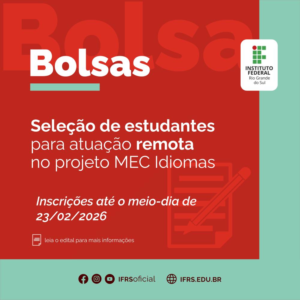 Uma oportunidade para estudantes do Instituto Federal de Educação, Ciência e Tecnologia do Rio Grande do Sul (IFRS), estão abertas as inscrições para a seleção de bolsistas para o projeto MEC...